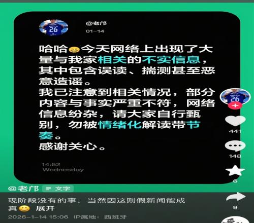 邝兆镭父亲:哈哈,今天网络上出现了大量与我家相关的不实信息,其中包含误读、揣测甚至恶意造谣。我已注意到相关情况,部分内容与事实严重不符,网络信息纷杂,请大家自行甄别,勿被情绪化解读带节奏。感谢关心。