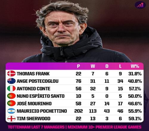 近7位热刺主帅英超战绩对比:弗兰克胜率31.8%最差,澳波第二差