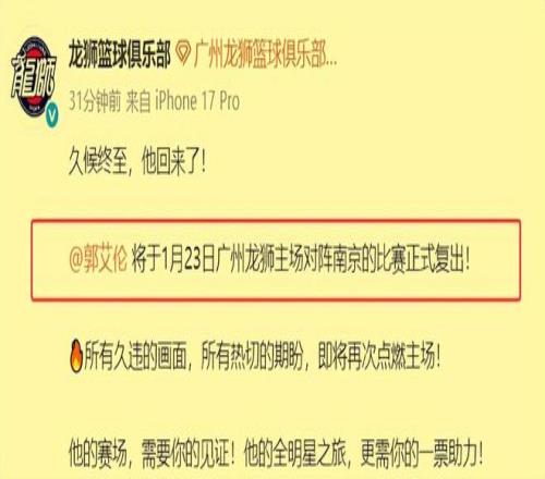北京时间1月21日下午3点56,广州队正式官宣,郭艾伦将于1月23日主场对阵南京同曦队的比赛复出,看来他的伤病已经痊愈了。